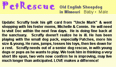 That night Scruffy and Lady Di snuggled up closer than ever. "Did you hear what they said about me?" he asked. "They said I am dying. I could die at any minute, and you are very sick too."