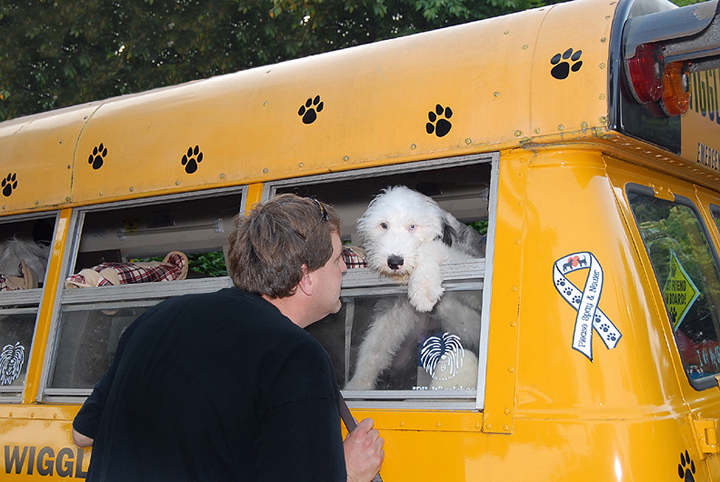 Mark followed the curious puppy closely. "Be careful! Wait until the bus is stopped before you go near it," he cautioned.