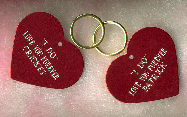 "Well no wedding is complete without your gold tag rings," she the cashier, handing them the fasteners for their wedding tags.