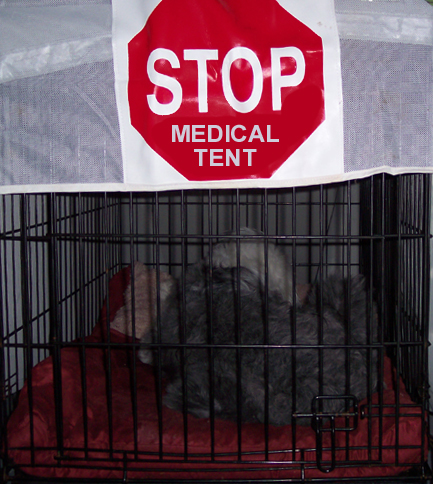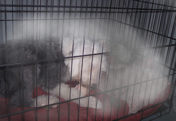 Patrick carefully covered the crate with a shower curtain and attached the vaporizer to make steam for the puppy to breathe.